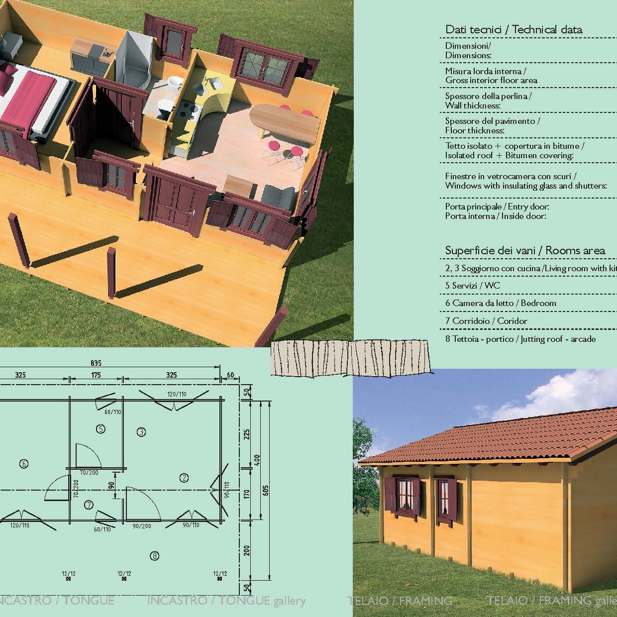 Madera abeto nórdico maciza de 60 mm, tratada al autoclave y con sistema mecánico de compensación de movimientos. Aislante térmico en cubierta 100 mm, cerramientos en PVC blanco con puente de rotura térmica y climalit 4-16-4.